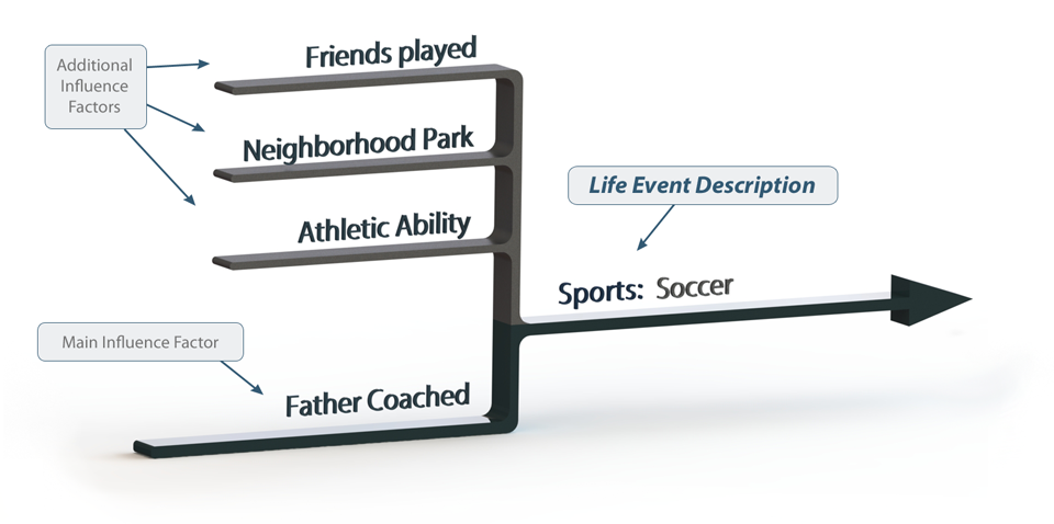 How do you build the perfect outline? Simply put, you should record what decisions influenced your life events. The decision tree diagram below makes this a stress-free process. In the below example, the user selected the event "Sports" listed on the previous table under the "Leisure" Category. The following decisions influenced why the user played soccer: "father coached", "athletic ability", "neighborhood park", and "friends played."