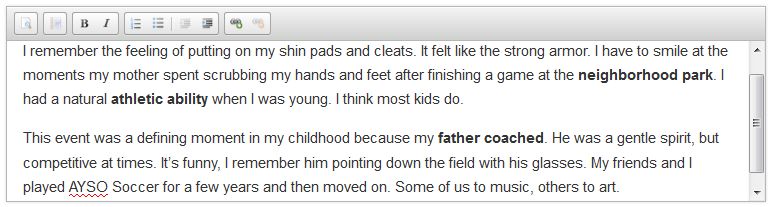 You have now built the perfect outline! It's time to add photos and draft short paragraphs for each event. Your photos can be uploaded with ease and we provide a simple text editor (see below) to keep everything stored in one place!